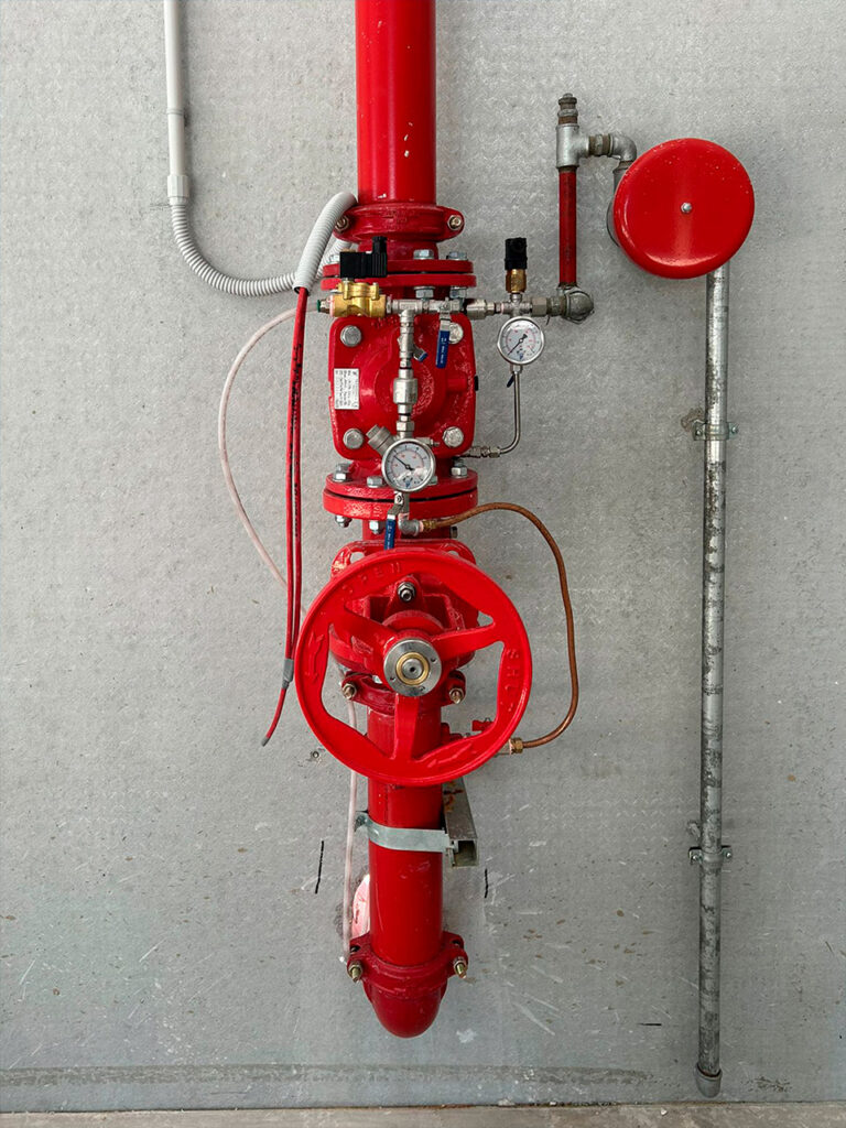 Per la struttura, di circa 10000mq , è previsto il classico anello esterno in polietilene con idranti sottosuolo mentre all’interno , oltre i classici idranti UNI 45 sono previste 3 lame d’acqua. Le lame d’acqua, di utilizzo comune in ambienti similari, sono costituite da tubazioni in acciaio preverniciato installate trasversalmente sulla volta del capannone, nel quale vengono inseriti degli ugelli piatti che creano una barriera d’acqua che impedisce la propagazione dell’incendio. Sono azionate da valvole motorizzate ad umido collegate alla rivelazione fumi.