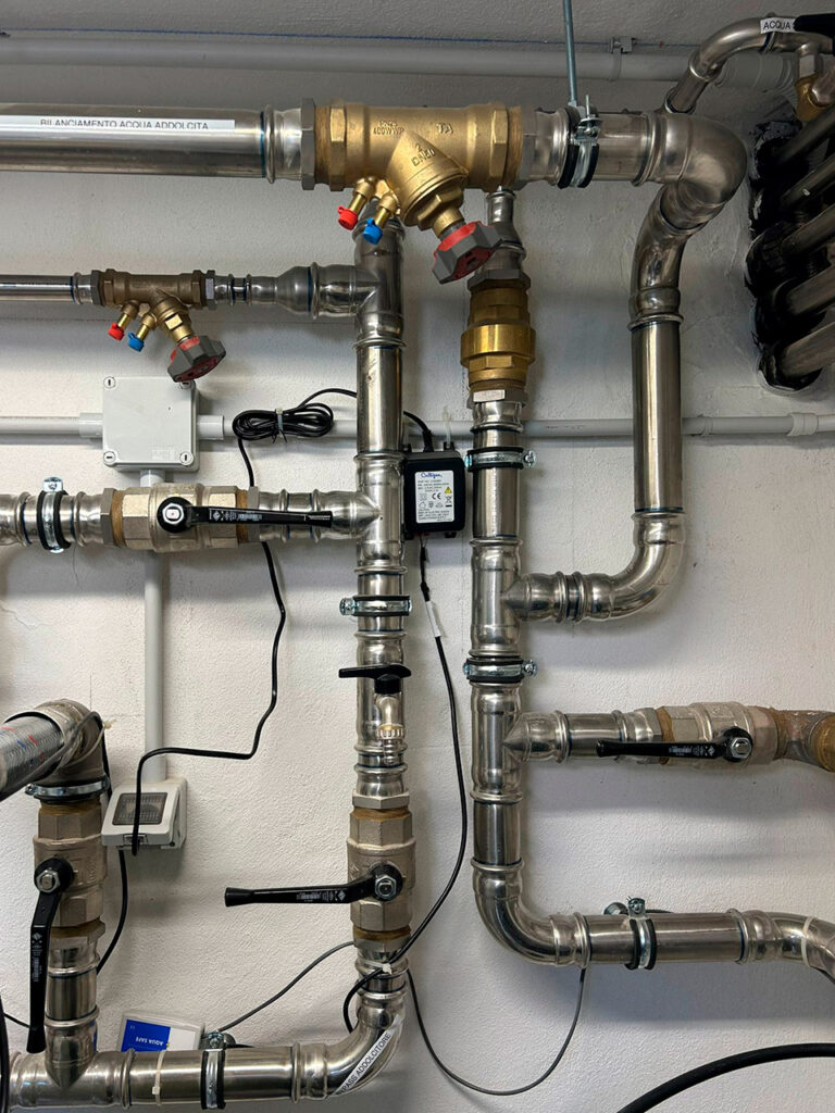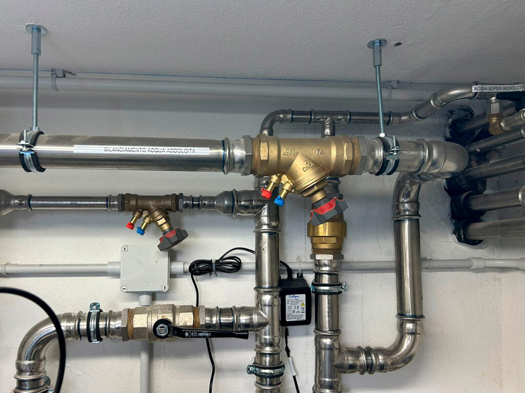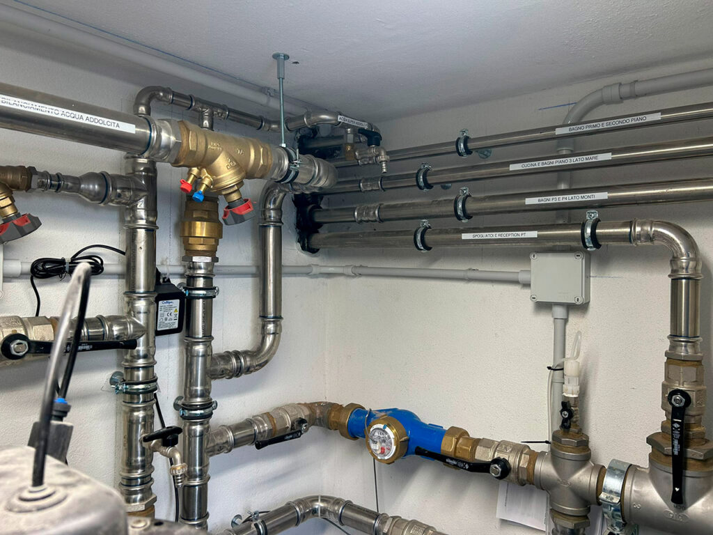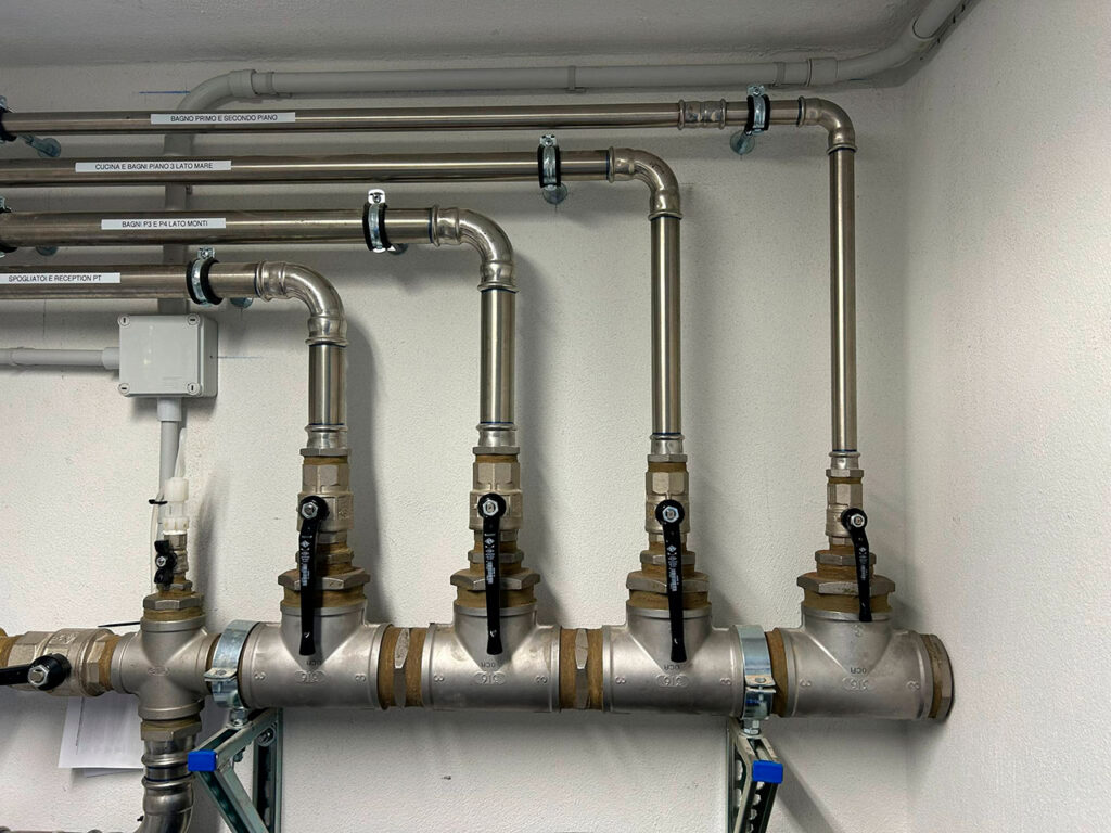 Una centrale idrica, con produzione di acqua calda sanitaria, alimenta i servizi degli uffici situati a decine di metri di distanza.