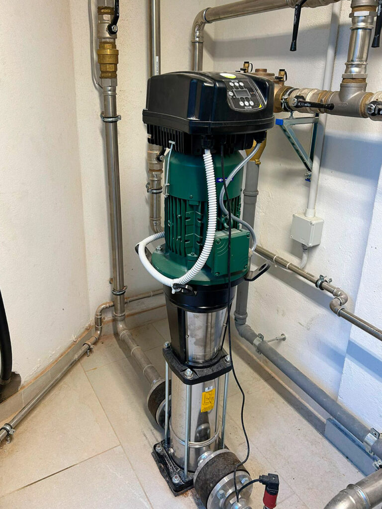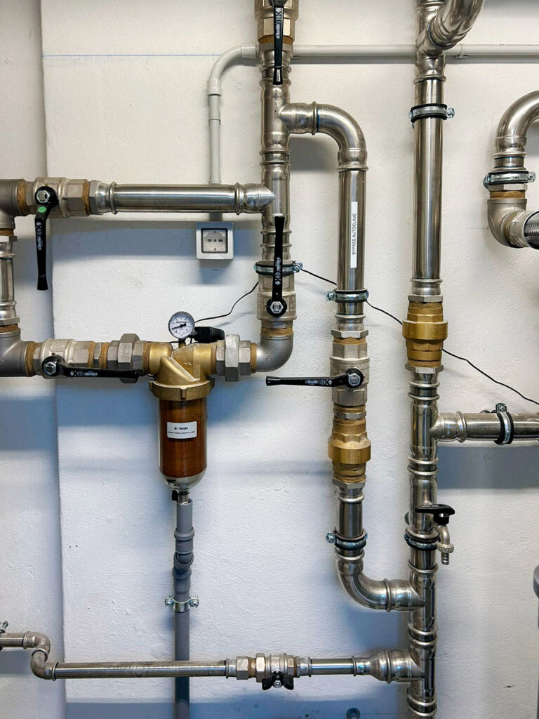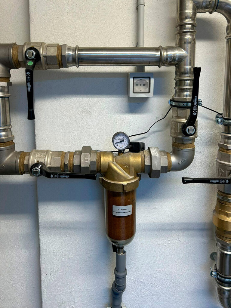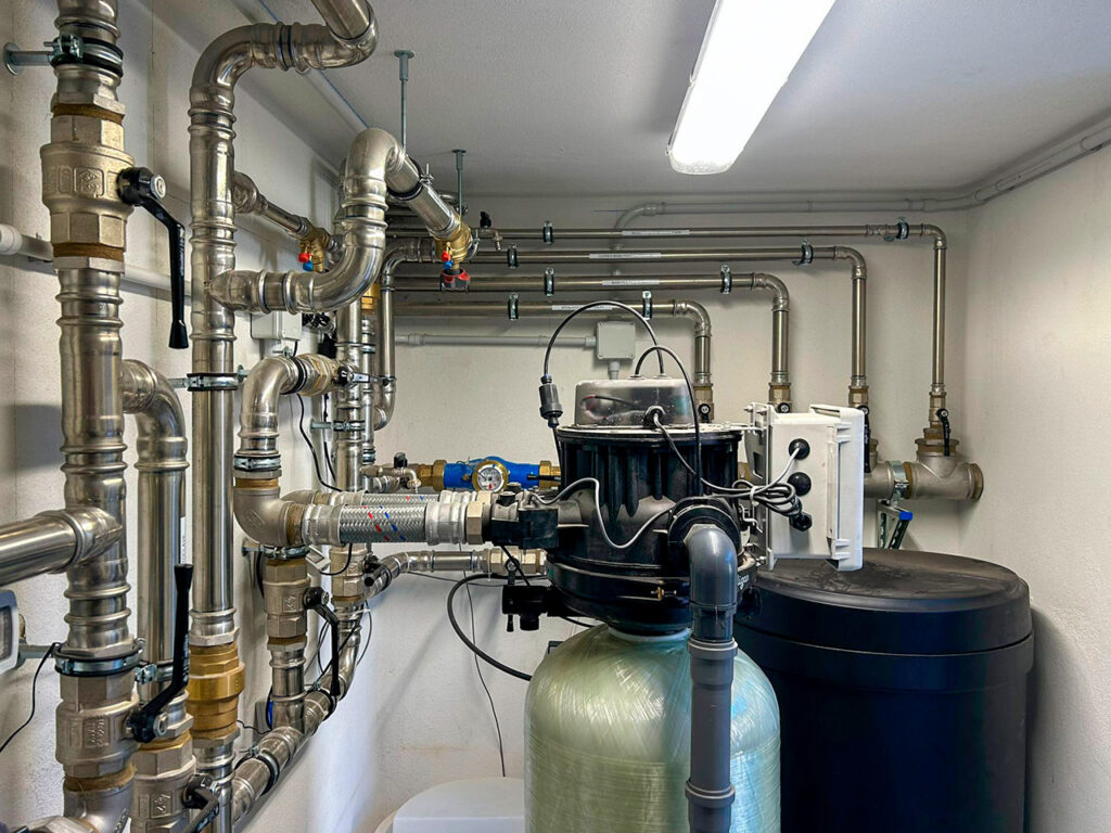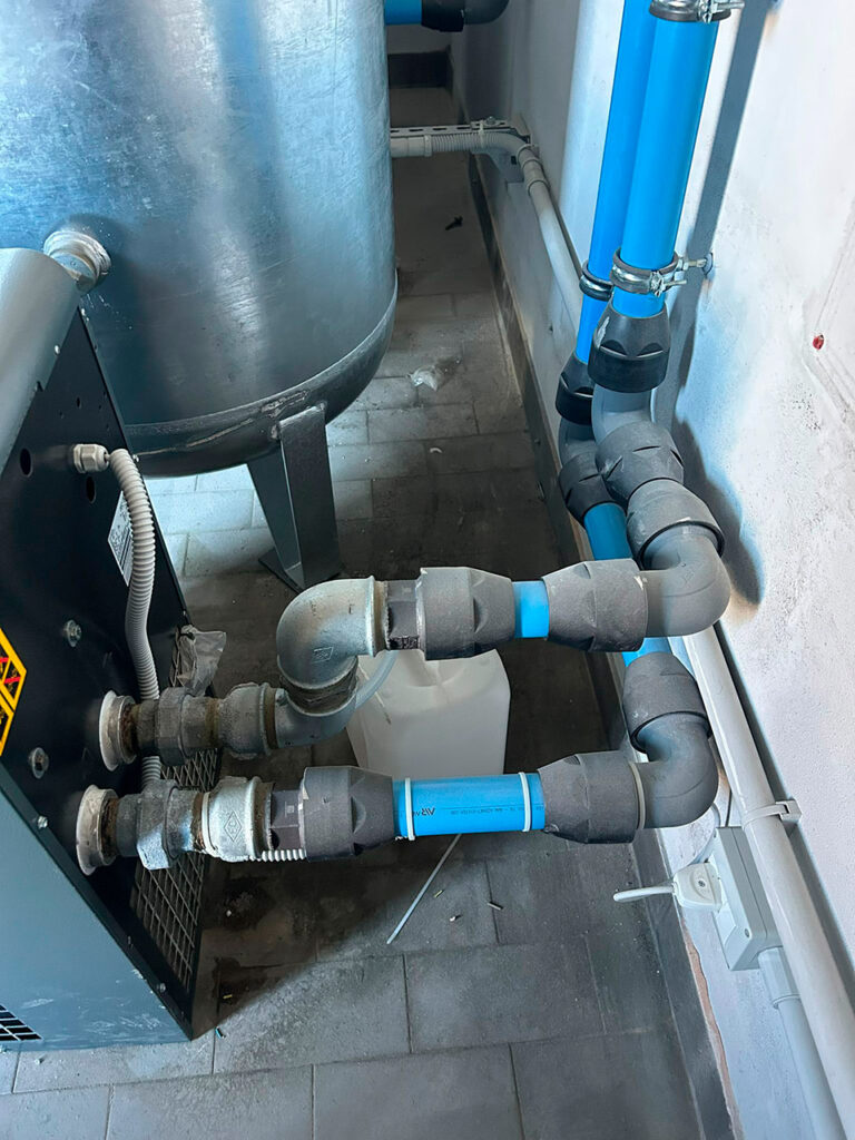 Una centrale idrica, con produzione di acqua calda sanitaria, alimenta i servizi degli uffici situati a decine di metri di distanza.